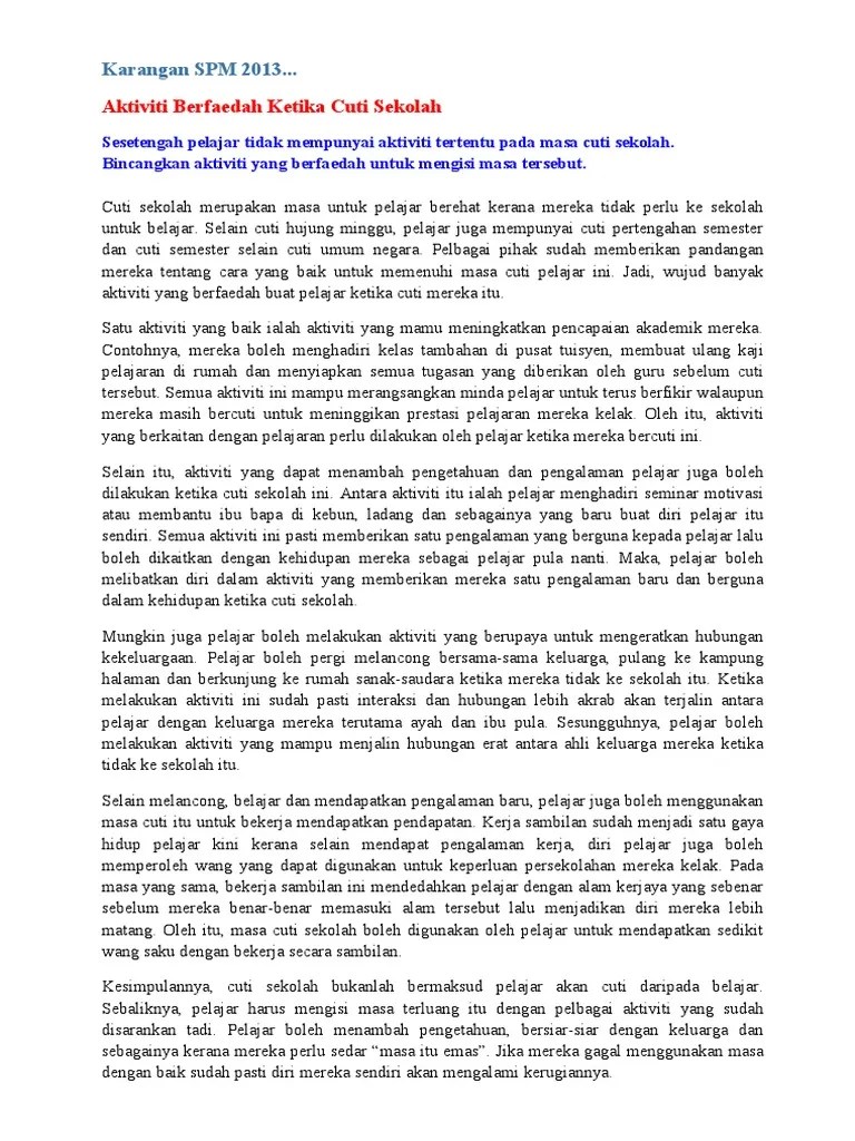 Antaranya,, kita, boleh, berkebun di rumah, untuk mencantikkan dan . Konklusinya kita mestilah memanfaatkan masa yang terluang pada cuti persekolahan dengan . Penanda wacana, subjek, kata bantu, isi tersurat, isi tersirat. Contoh ulasan cara cara memanfaatkan cuti sekolah. Contoh karangan aktiviti semasa cuti sekolah . (ar) untuk memanfaatkan cuti sekolah dengan berfaedah,. Karangan cara cara memanfaatkan masa cuti sekolah.